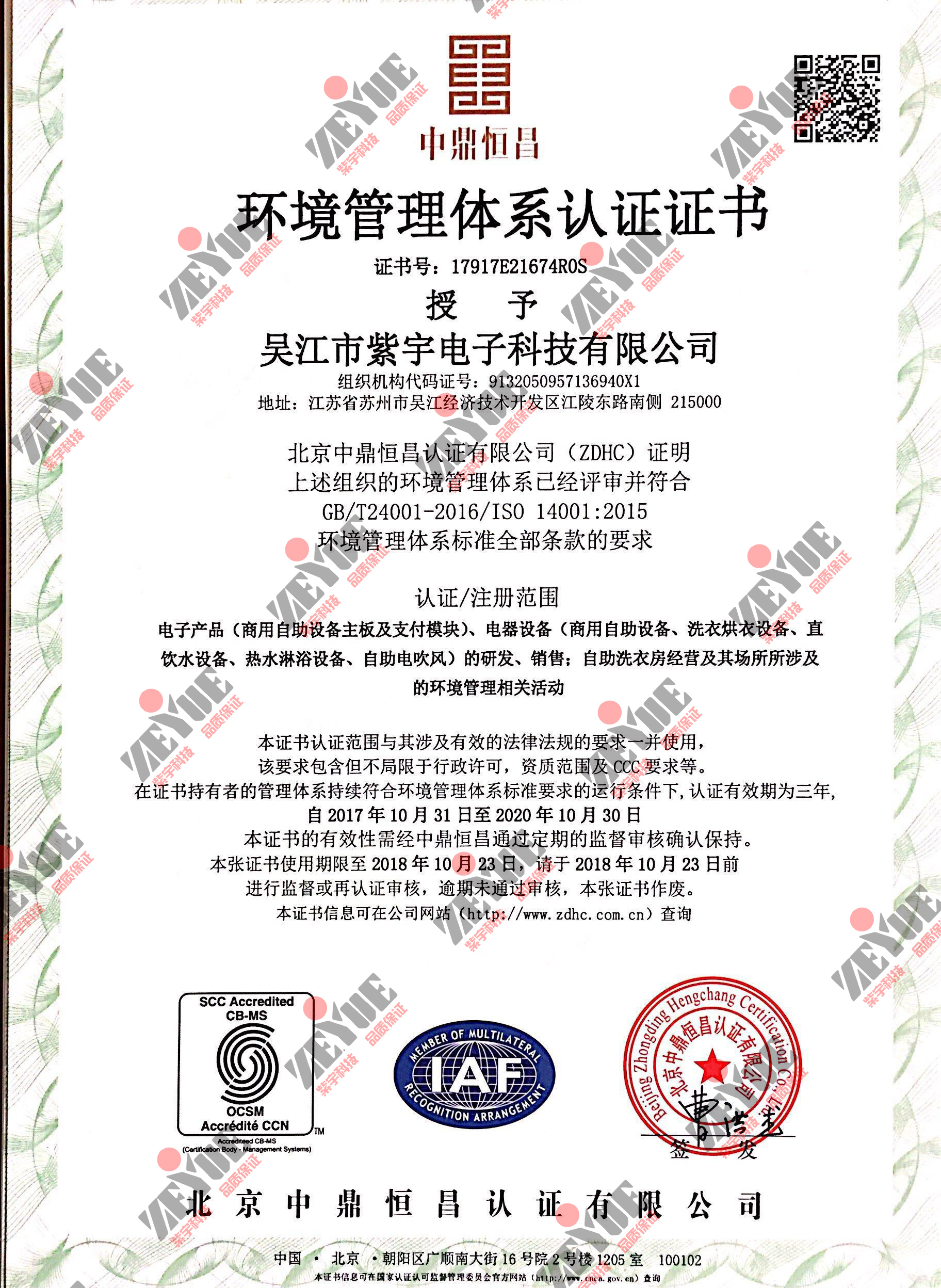 環(huán)境管理體系認證證書